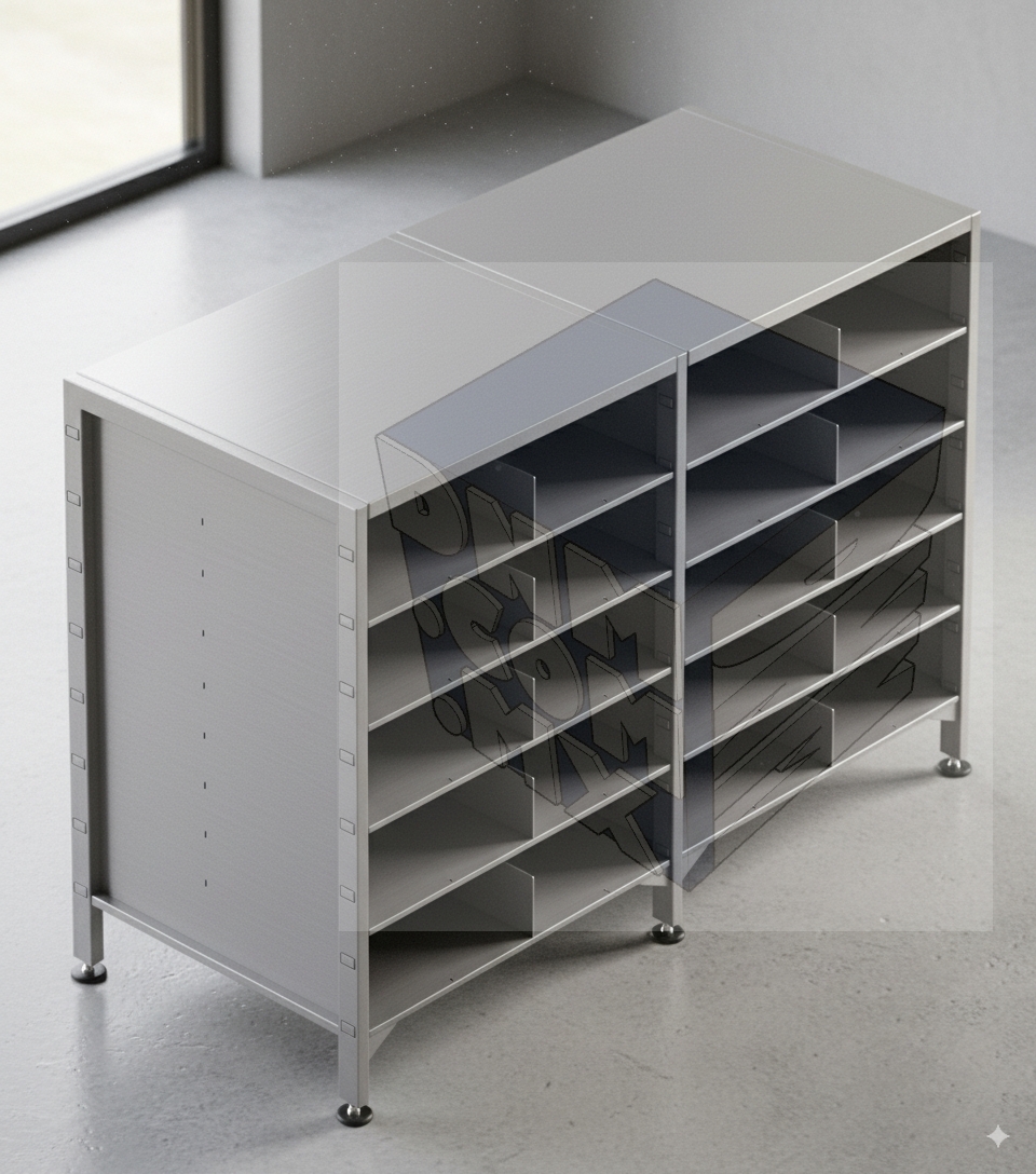 EN LA PARTE INFERIOR ESTARÁ PROVISTO DE UN SISTEMA DE SUJECIÓN PARA COLOCAR REGATONES NIVELADORES. PLACA DE ACERO CALIBRE 12, SOLDADA AL PERFIL CON INSERTO ROSCADO DE ACERO O TUERCA INSERTADA A BASE DE DOBLECES EN LAMINA DE ACERO CALIBRE 14 SUJETA AL PERFIL A BASE DEL MISMO SISTEMA DE DOBLECES. ACABADO EN PINTURA COLOR* SEGÚN MUESTRA IMSS. ENTREPAÑO CON RANURAS PARA COLOCACIÓN DE DIVISORES, FABRICADOS EN LAMINA DE ACERO C.R. CALIBRE 20 CON DOBLEZ PERIMETRAL Y CON PERALTE DE 25.4mm (1”) CON REFUERZOS EN LA PARTE INFERIOR Y EN LOS CUATRO COSTADOS, A BASE DE CANALETAS Y PERFILES DEL MISMO MATERIAL Y CALIBRE, EL ENTREPAÑO DEBERÁ SER DISEÑADO CON LOS ELEMENTOS NECESARIOS PARA INSERTARSE EN LOS MARCOS VERTICALES DE TAL FORMA QUE EL ENSAMBLE DE LOS ENTREPAÑOS CON LOS MARCOS VERTICALES SEA BUENA APARIENCIA, ACABADO Y GARANTICE ESTABILIDAD Y RESISTENCIA A TODA LA ESTRUCTURA