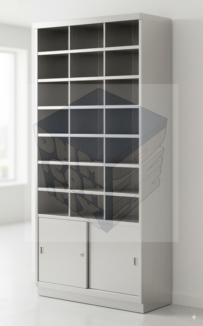 3-PUERTAS CORREDIZAS DE LAMINA DE ACERO CALIBRE N°22 CON JALADE- RAS INTEGRADAS; ACABADO EN PINTURA COLOR GRIS Y CERRADURA