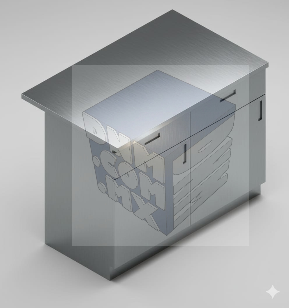 Cubierta lisa fabricada en acero inoxidable, AISI 304, calibre 18, con 120 cm de frente x 75 cm de profundidad con respaldo de 10 cm de altura y 3 cm de ancho; soportes fabricados en acero inoxidable, AISI 304, calibre 18, tipo costilla en “v” hacia la cara de la cubierta y terminado liso hacia el mueble, colocados en sentido horizontal de la cubierta.